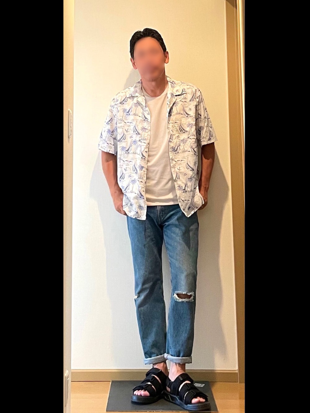 レインスプーナーのシャツにダメージデニムを合わせて、久々にカジュアル100% お盆休みに甥っ子と格闘してやるコーデですっ
