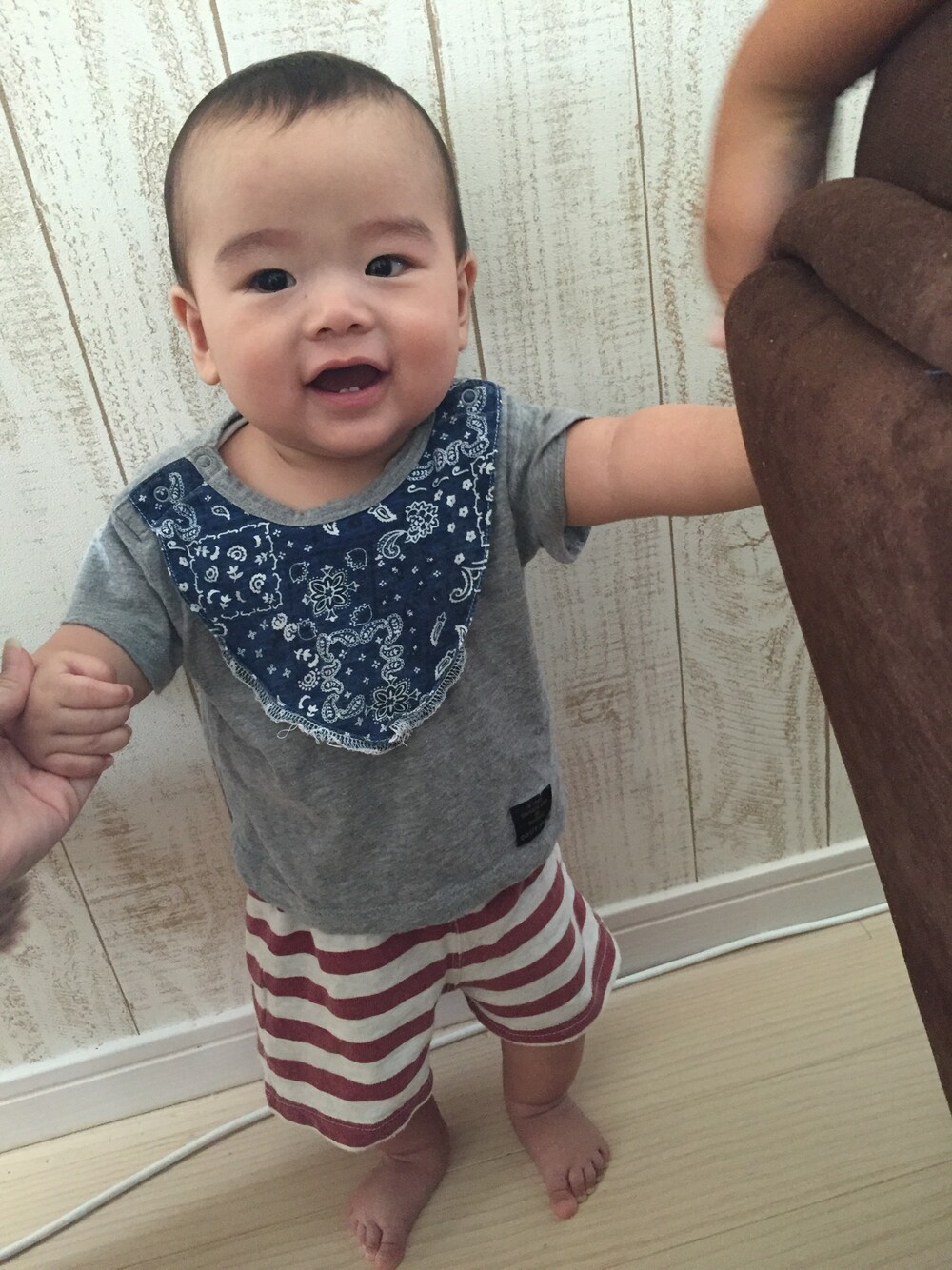 6ヶ月の次男です(^^) 家族の癒し♡ お兄ちゃんお姉ちゃんから可愛いがられすぎて 泣く毎日 笑 プティマインのセットアップは可愛いくて 人からいっぱい褒められます♡ お気に入り♪