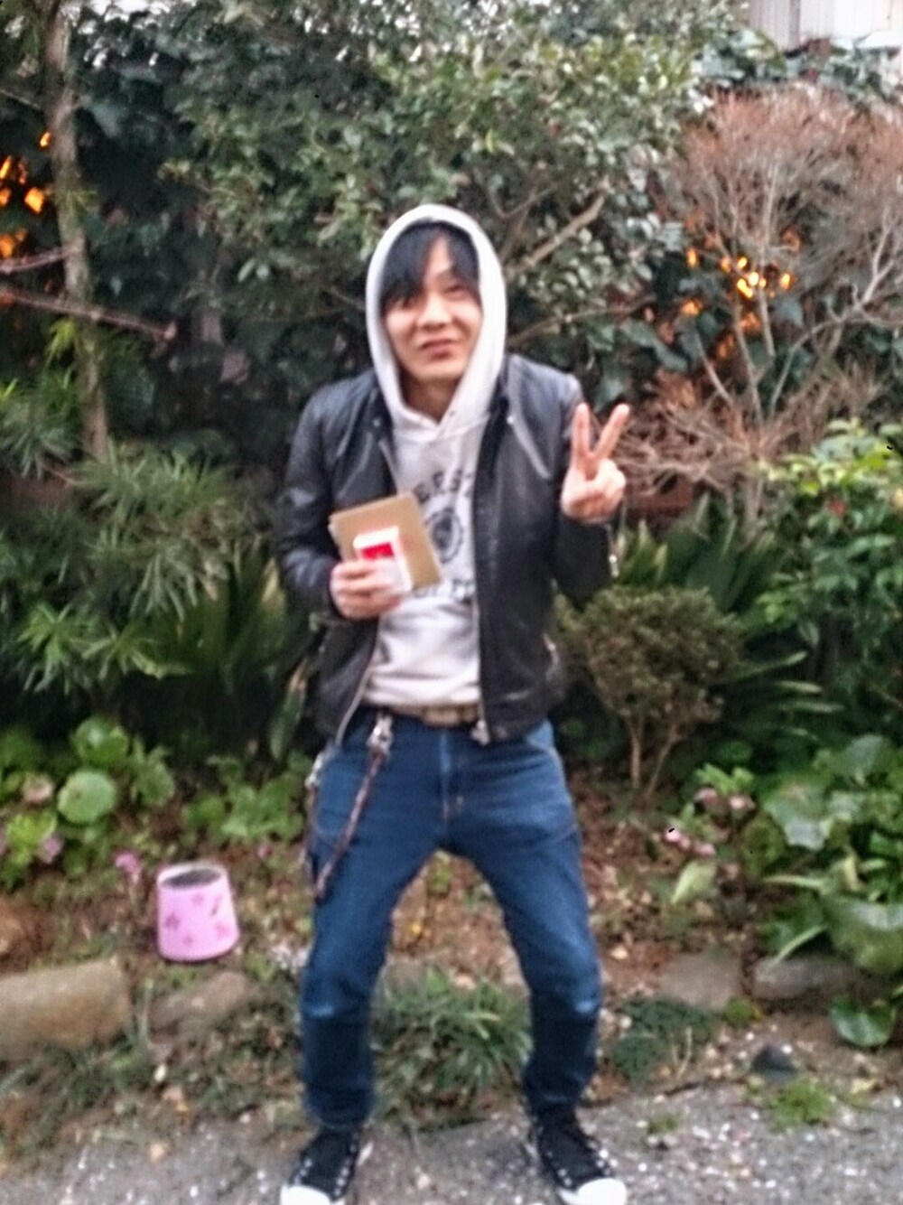 大分暖かくなってきましたが、風が強かったからパーカーかぶりやした。 手に持ってるのはタバコとCDです(^-^ゞ
