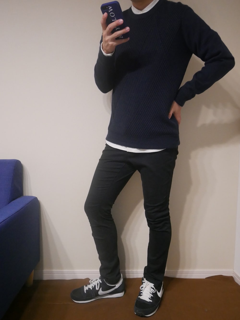 この黒スキニー便利すぎます 安いし🤡 ⚫️着用サイズ⚫️ ニット M シャツ M パンツ 76 靴 27.0