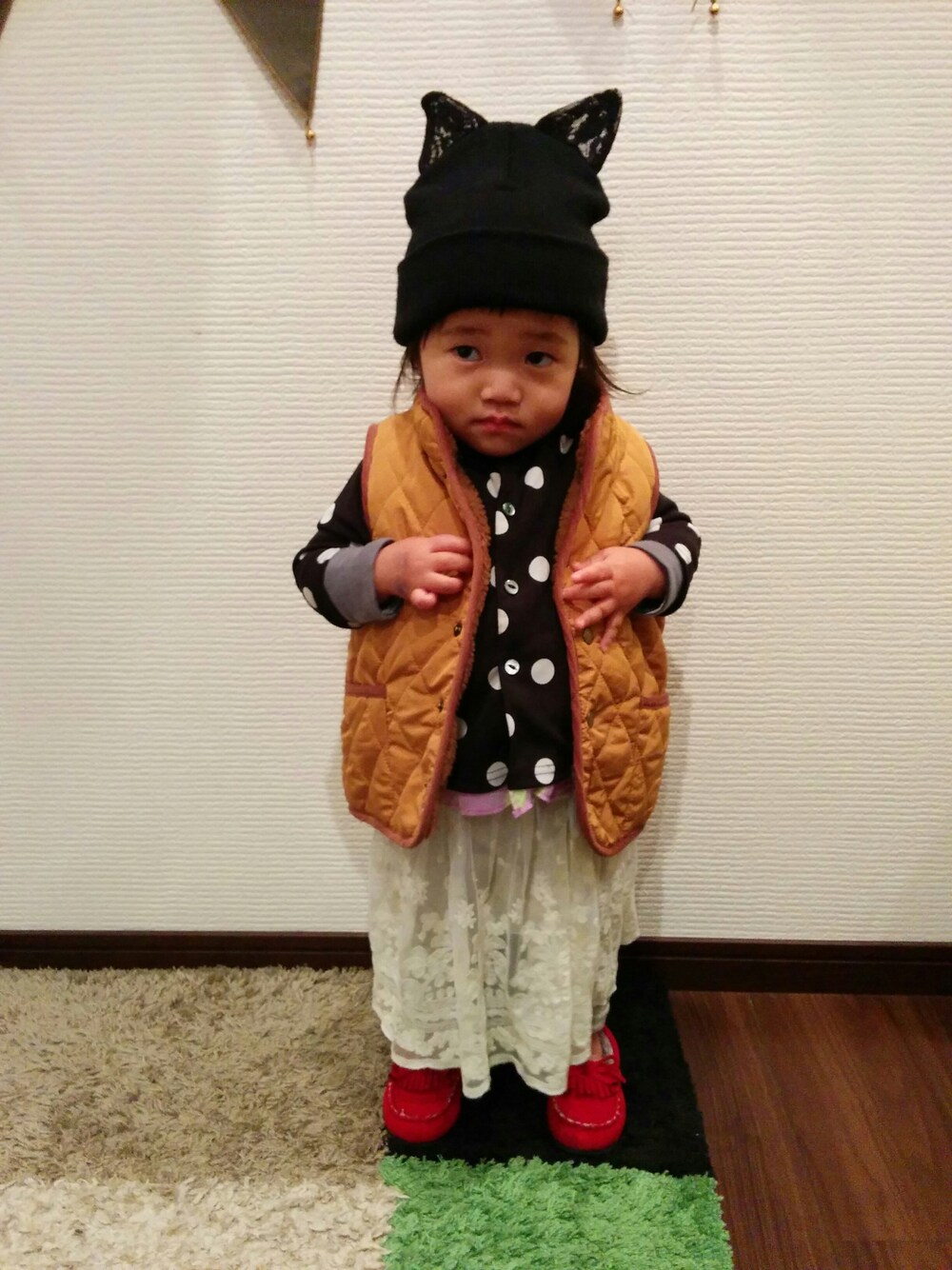 今日はちゃるりんガチャガチャコーデ😁😁😁 ネコ耳ニット帽しつこく使い回してまたもや登場😺 色とか柄とかガチャガチャしたコーデも結構好きです💓 ちゃるりん熱と咳で保育園お休みしたけどめっちゃ元気😅💦昼寝もせず盛大に散らかしまくって遊んでおります😵 あっ、でも今日のコーデは週末撮ったやつで今は思いきり部屋着でのんびりちゃるりん😪😪😪