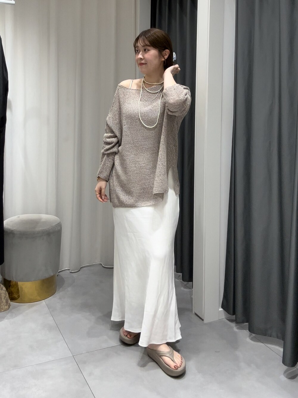 ┈┈┈┈┈┈┈┈┈┈┈┈┈┈┈┈┈┈┈┈┈┈┈┈┈┈┈┈┈┈ 夏まで使える和紙ニット♡ わたしのイチオシの細見えニットです! 前後2WAYで着れるので合わせるアイテムによって雰囲気も変えて着ていただけます◎ 細見えスカートと合わせたら簡単に スッキリみえコーデの完成です^ >ᴗ<^ ┈┈┈┈┈┈┈┈┈┈┈┈┈┈┈┈┈┈┈┈┈┈┈┈┈┈┈┈┈┈ トップス color: ベージュその他1 スカート color: オフホワイト size: FREE