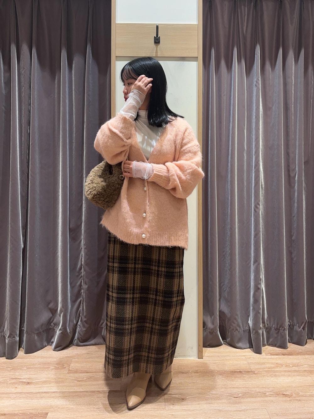 ご覧いただき有難うございます🫧 Techichiエビスタ西宮店のhinaです💐 ………………………………………………………… ೯トップス ハイネックのインナーにピンクのVネックニットをレイヤードしています! インナーはお袖がチュールになっているので、レイヤードのトップスから見せるとおしゃれな印象です⸝⋆⸝⋆ カーディガンは、幼く見えがちなピンクですが、首元がすっきりとしたVネックとパールのボタンで、大人っぽく着こなせます◎ ೯ボトムス トップスがシンプルなので、ボトムスは大きめチェックのタイトスカートにしました! しっかりとした生地感で、真冬でも暖かいです♩ 細身なシルエットですが、後ろゴムとバックスリットで楽に着られました❁ ………………………………………………………… ⚫WEAR ✢ますき【@sei1225】 ✢hina【@hiip17】 是非フォローを宜しくお願い致します✨
