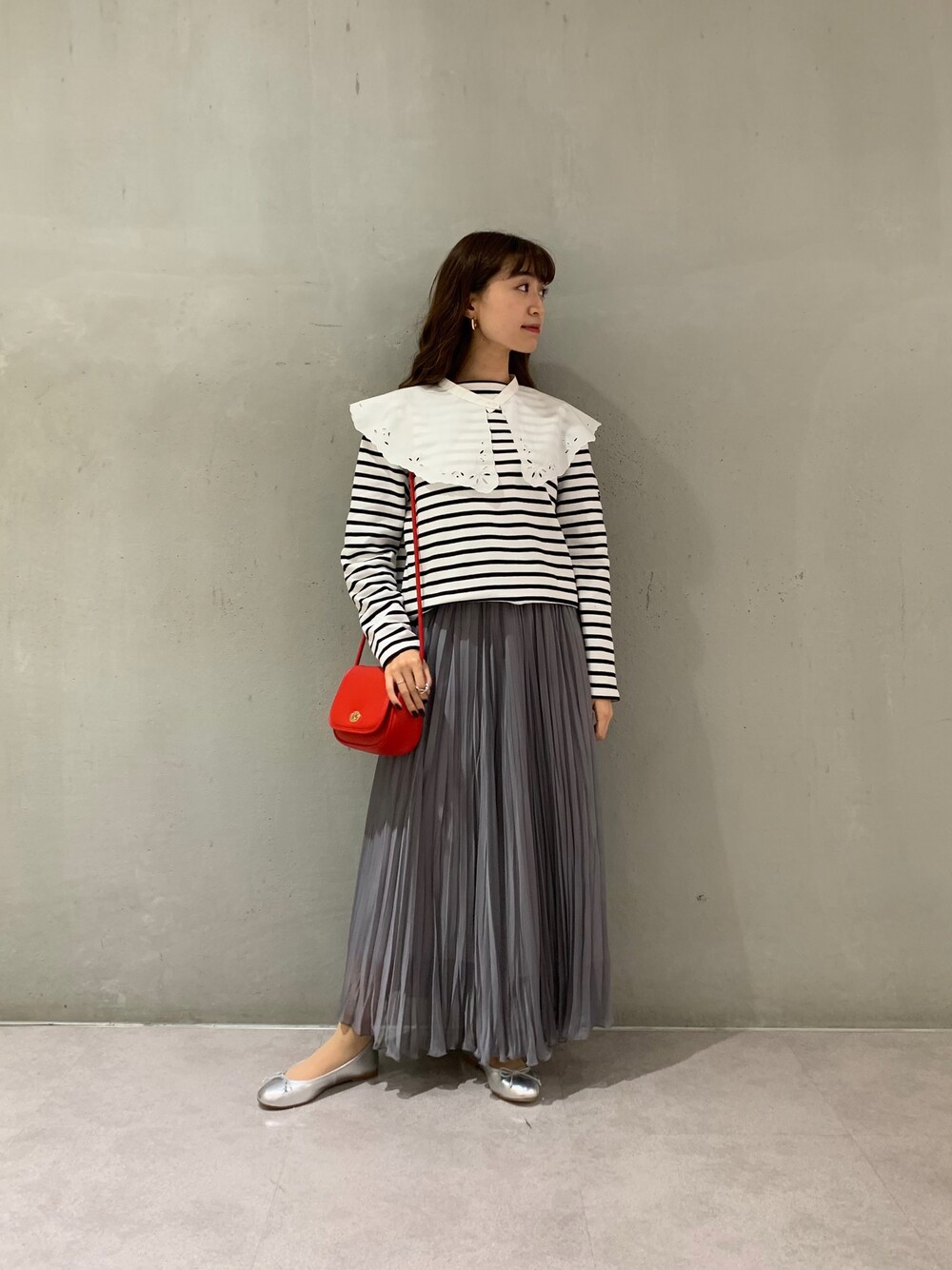 ワッシャー加工ランダムプリーツスカート お問い合わせ番号:GWC41500 ●156cm/34サイズ/骨格ウェーブ×ナチュラルミックス ●着用サイズ:38(フリー) 【サイズ感】 身長156cmで丈はくるぶし丈で、フラットシューズでも引きずらずに着られます。 ウエストはゴムですがやや大きめです。 【素材感】 とても軽くてサラッとした素材感です。 裏地もツルッとした素材で、肌あたりも柔らかいです。 【着心地】 ロング丈ですがとても軽いので楽に履いていただけます。 今の時期はブラウスやカットソーで、冬はニットや厚手のトレーナーなどと合わせて着ていただくのもおすすめです。 【スタイリングポイント】 軽やかなプリーツスカートを、ボーダートップスでフレンチカジュアルにコーディネートしました。 スカートはとっても軽い素材なので楽に履くことができ、シーズン問わずお使いいただきやすいアイテムです♪ トップスは春も大人気だったセントジェームスのバスクシャツ◎ 今ならサイズもお選びいただけます! ※付け襟は、クレリック付け衿ブラウス(GWH41320)の付属の付け襟を使用しています。