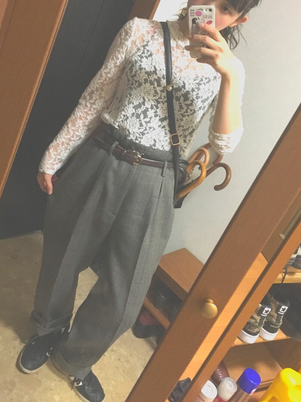 ちょっとトーン抑えめの秋移行コーデ◎ レース×おじチェックのパンツ(しかもぶかぶか)でちょいダサレトロ👶🏼 まさか今年グレンチェック流行ると思わなかったよ🙄