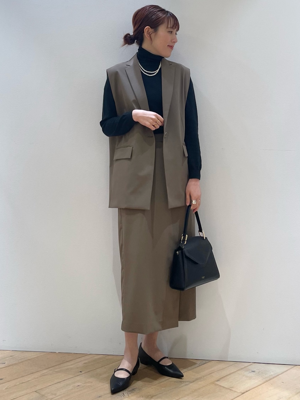 【基本プロフィール】 身長:162cm 年齢:30代前半 骨格タイプ:ストレート 普段着用サイズ: トップス・ボトム→Mサイズ シューズ→24cm 【ジレ】Fサイズ ▼サイズ感 肩周りや見頃がゆったりめのオーバーサイズシルエット。着丈はヒップ下で安心です。Iラインでスッキリした印象になります。 ▼着心地・生地感 薄手で軽く、シワがつきにくい生地感です。薄いカーキのような色目のダークベージュで、洗練された大人のセレモニースタイルに! 【スカート】38サイズ ▼サイズ感 後ろの部分がウエストゴムになっていて窮屈感なく履けます。着丈は162センチでふくらはぎ下、足首がしっかり出るくらいです。 ▼着心地・生地感 巻きスカート仕様です。重なる部分の布を多めにとっているので、足が見えにくくなっています。薄いカーキのようなダークベージュで、洗練された大人のスタイルに!