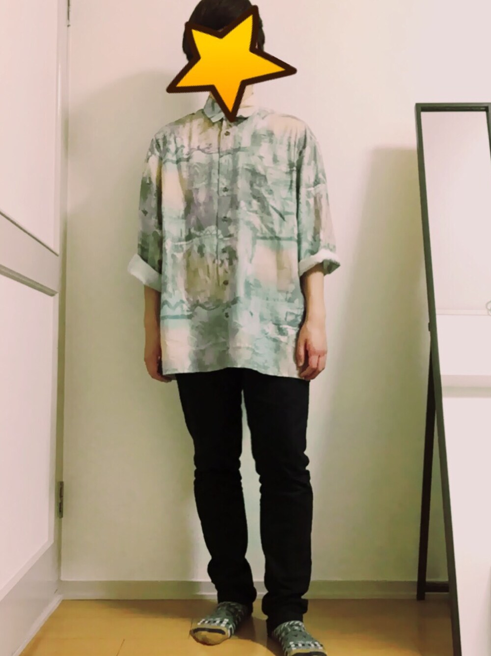 調子に乗り、早くも第4弾!! 一昨日のブルゾンを脱いだだけですが、腕を捲ることで、シャツのいい具合のサイズ感が出せてるのでは…✨ この柄ならば、そうそう他人とかぶることはないかなと思ってます👍👍