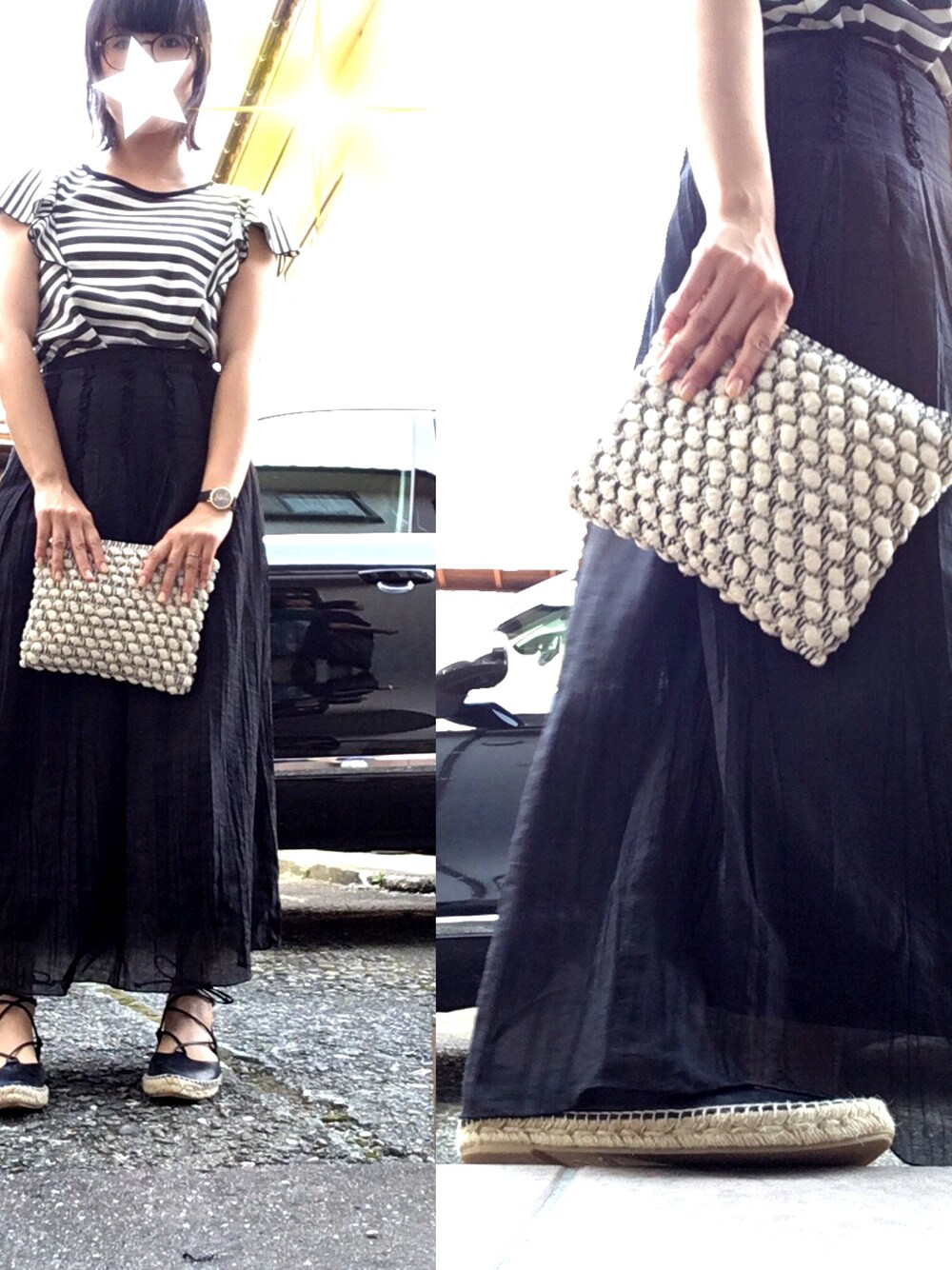 白×黒コーデ。✨何年も前からヘビロテしてるボーダーのトップスに黒いロングスカートの古着。ちっさめクラッチにはスマホとハンカチ、ティッシュ、ウェットティッシュと子供用エジソンの箸を入れてファミレスへgo!!🚗