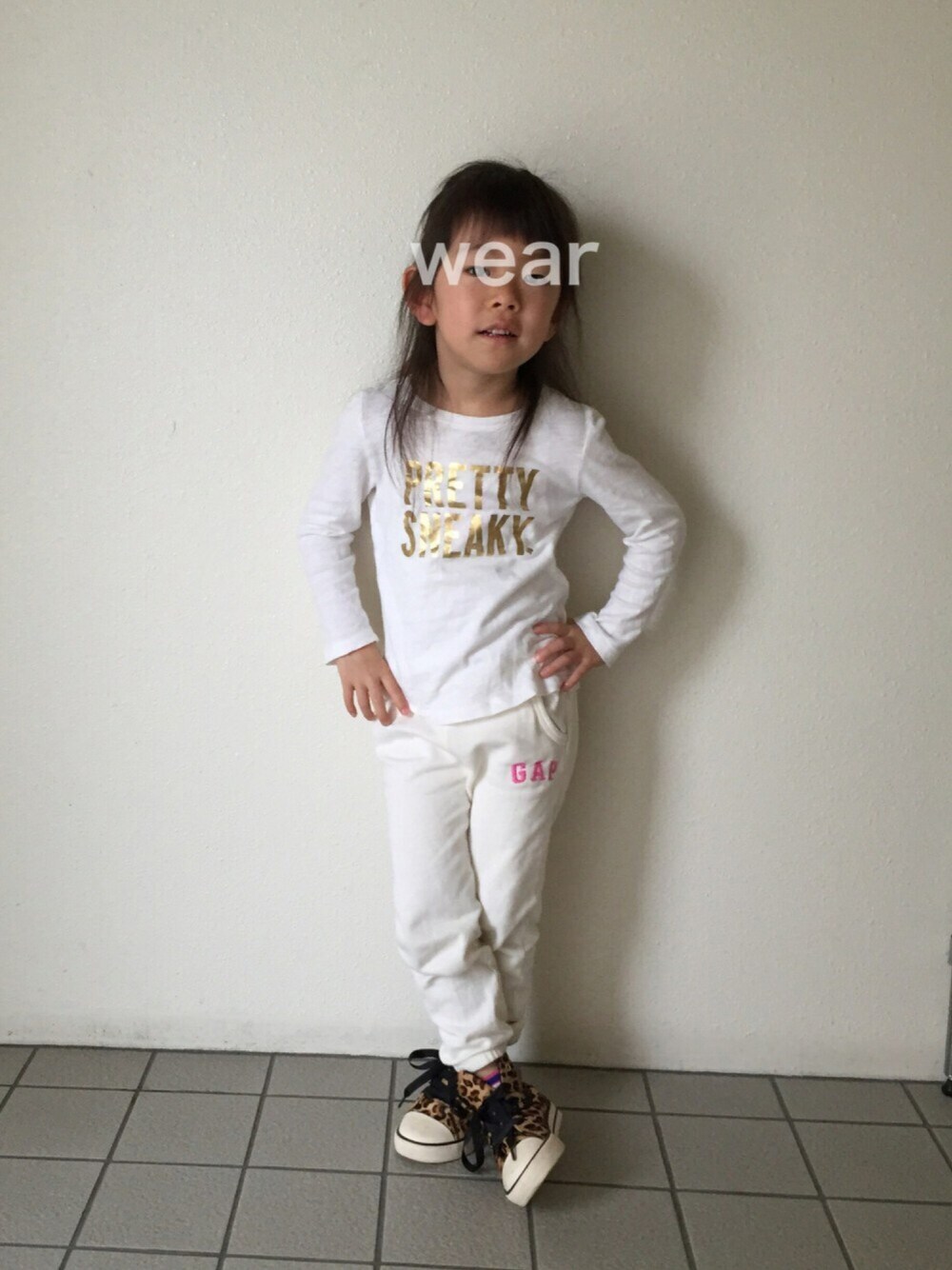 ホワイト系のパンツ、ブラウン系のスニーカーを着用したキッズの春コーディネートの1枚目の写真