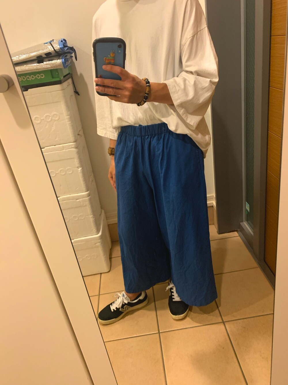 今日も涼しげな白×青のコーディネートです! 白を基調として、ボトムスに青を持ってきました。 Tシャツがかなりオーバーサイズなので、タックインすることでパンツが隠れないようにして、さらにルーズになり過ぎないよう配慮してます! カジュアルコーデなのでブーツではなくスニーカーを合わせてみました。