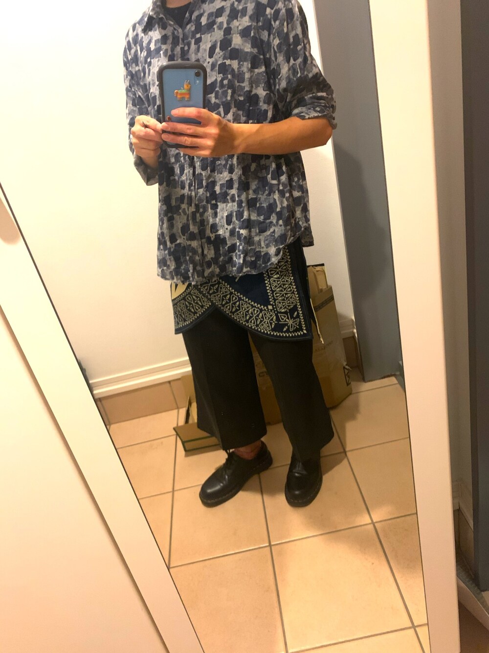 私事で少し空いてしまいすみません! 本日は柄シャツを使った個性派コーディネートにしてみました! 色使いとしては黒×ネイビーの二色で少なめですが、使っている総柄のシャツや腰のメンズスカート、ワイドのアンクルパンツ等で個性を出してます! 色は抑えめですがパッと見た時のシルエットで印象を与えるコーディネートとなっております。