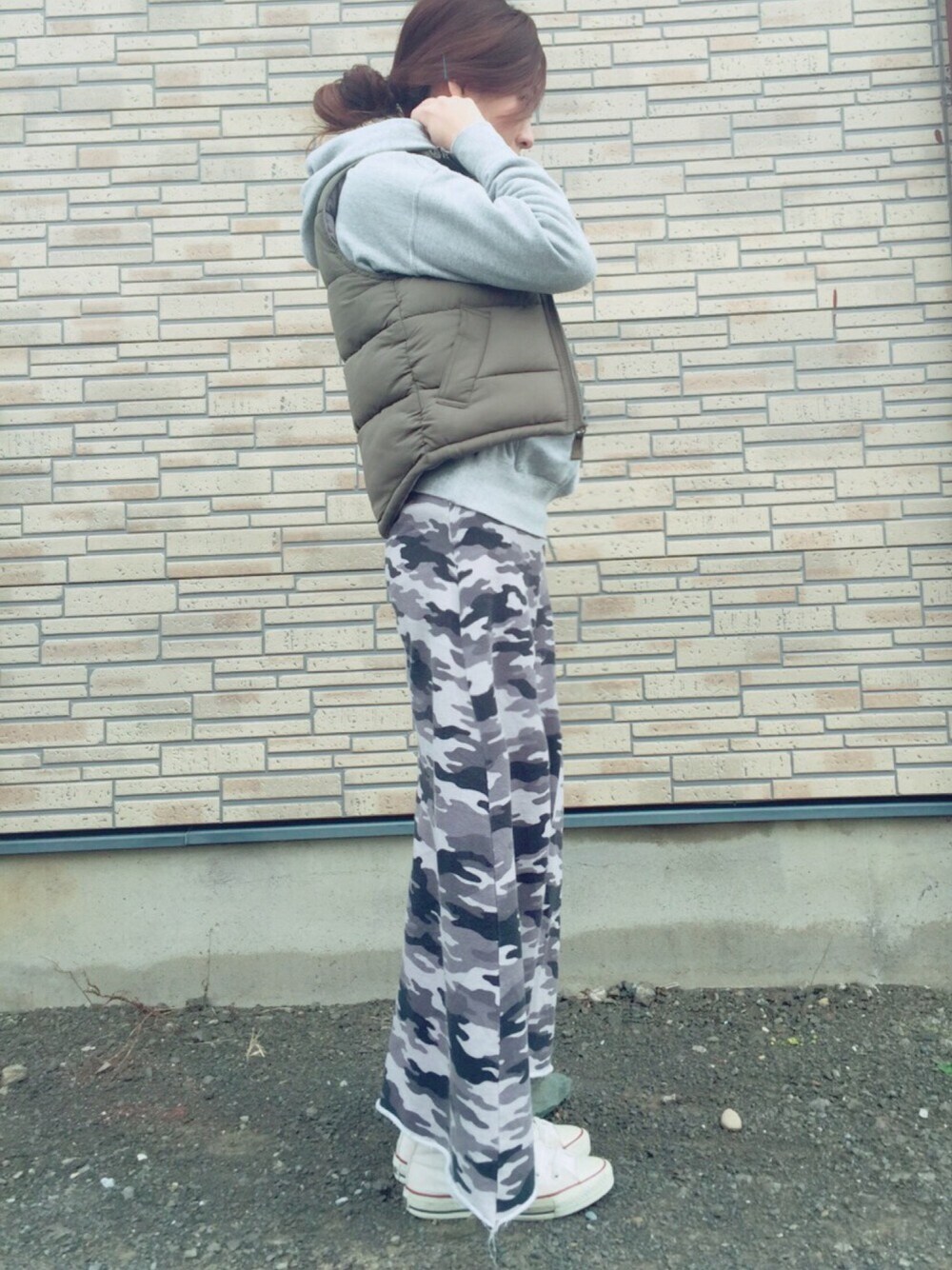 ちょっと羽織るのに便利なダウンベスト。 息子が着ていたものをちょっと拝借🙏🏼 結果、小さすぎてチャックも締まらない🙄 120サイズだから当たり前か😵 何年か前に作った、カモフラロングスカート。 中にレギンス履いてます👖