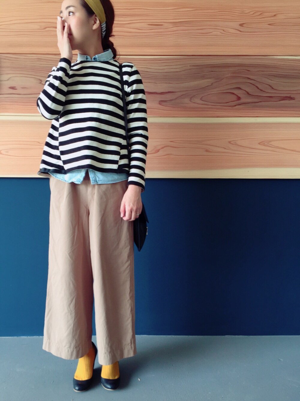 デニムシャツは、フレンチスリーブなので重ね着してもモコモコしなかったです☺️ ヘアバンと靴下の色味を合わせました☺️