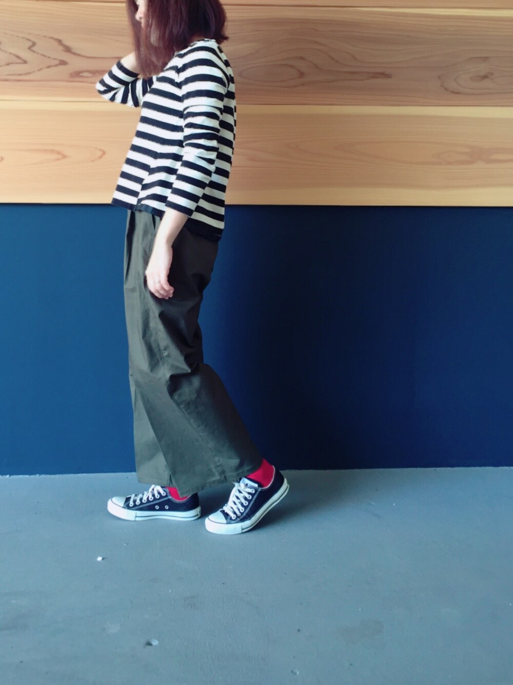 ハンドメイドのワイドパンツ、形が良かったので色違いで作りました☺️ オリーブのパンツは、何にでも合うから着まわししやすい☺️
