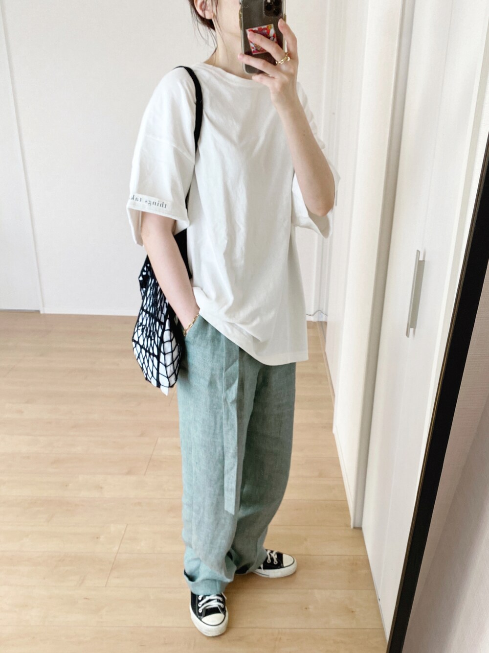 ビックシルエットのTシャツと ゆるっとパンツの ゆるゆるコーデ。 パンツの生地感が だらしなくならなくて すき。