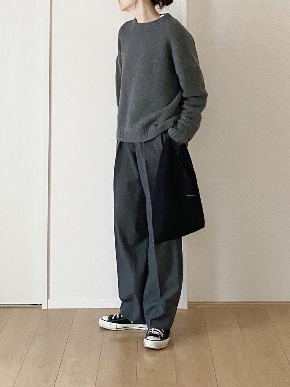 グレー×黒の ツートンコーデ。 シンゾーンのスラックスが 優秀すぎる。