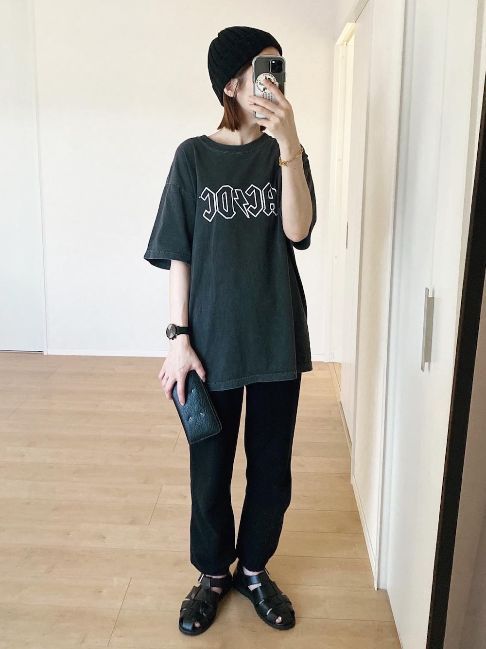 ロックTシャツの 着回し❸ とことんラフに。 ゆるTシャツにスウェットパンツだけど だらしなく見えないように 小物は 大人にアイテムを 意識しています。 エヌハリのスウェットも ほんとに形が綺麗。 素材も ふわふわ フカフカ。