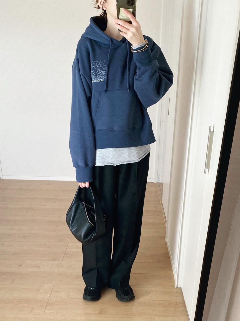 丈が短めのパーカーは シースルーのカットソーを覗かせるのがかわいい♡ ナイキのズームは デザインがハードに見えて オールブラックなので 意外と何にでも 馴染みます☆