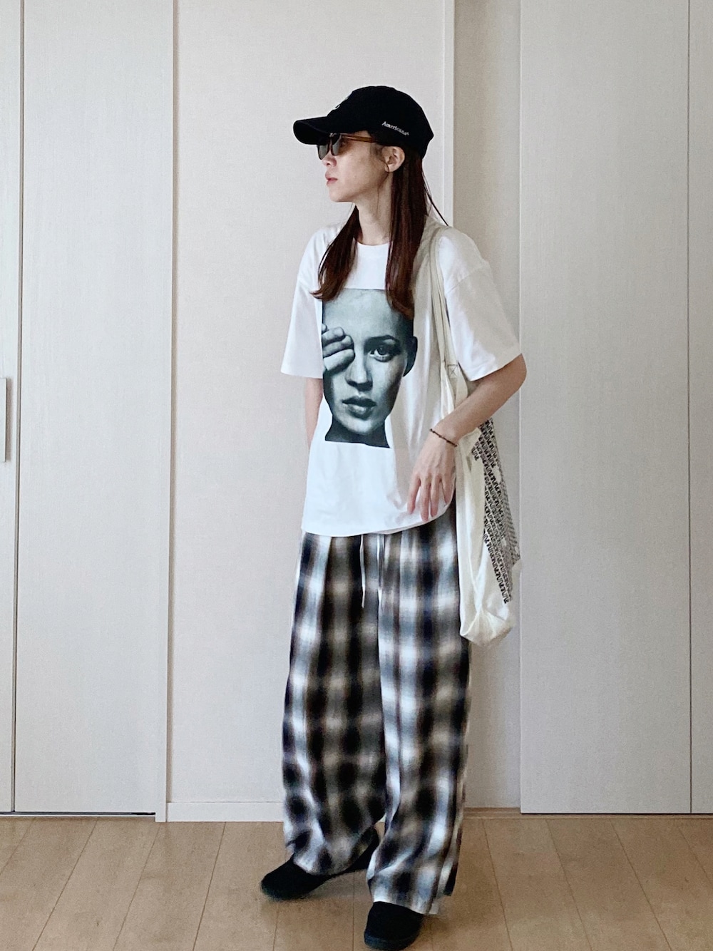 ゆるカジュアル。 キャップとサングラスで 日焼け対策。 チェックのパンツで 秋色を投入しました🍂