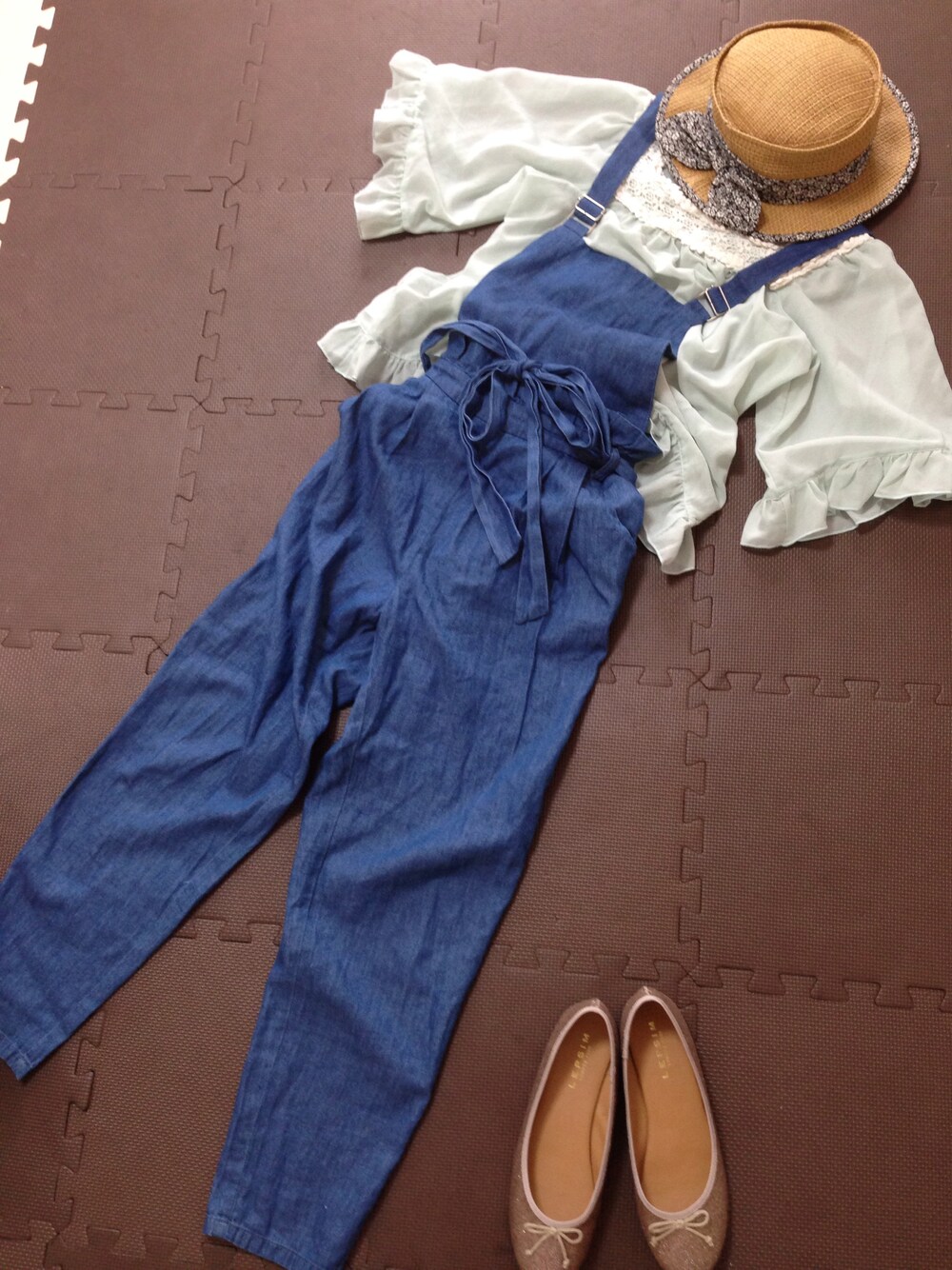 サロペットのサイドから、ガーリーなトップスの裾をぴらぴら出すのが好きです♥️ 下半身のボリュームが、ごまかせそうな気がして着やせ効果を期待✨