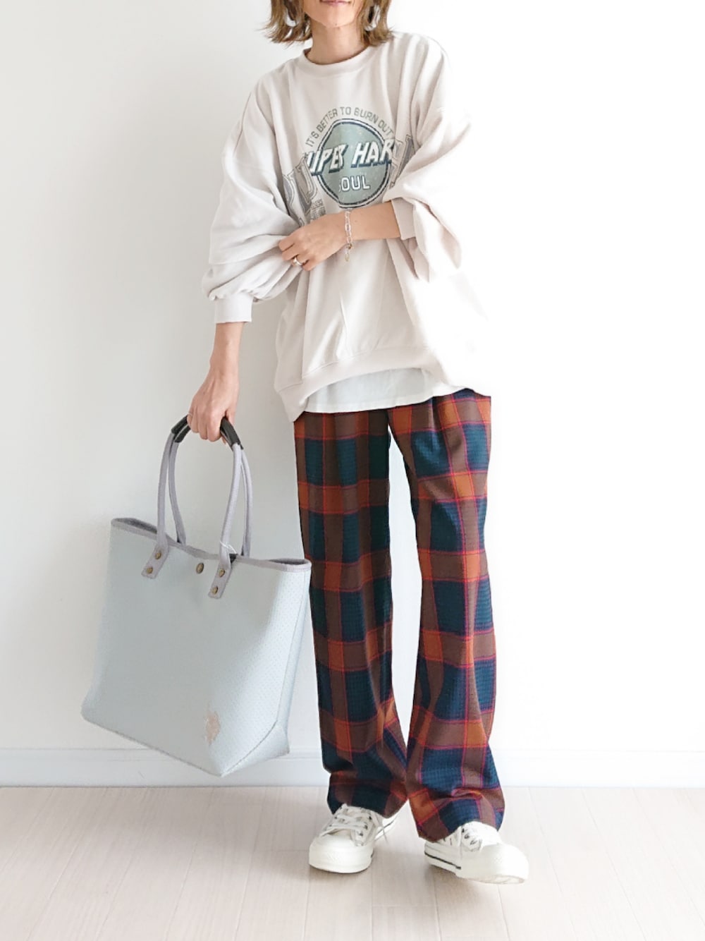 𝕪𝕦𝕚のスウェット「カレッジ&サークルロゴプリントヴィンテージ風スウェットトレーナー」を使ったコーディネート
