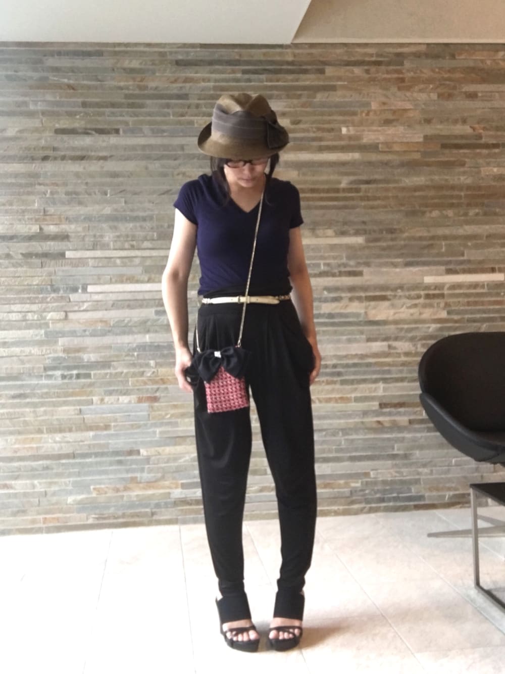 通販で購入したGUのTシャツを早速着用。ぴったりフィットして色もいいし、着やすい!インド雑貨屋で購入したサルエルパンツと合わせ、家着みたいになったので、チェーンベルトでしめまし た。モノトーンコーデにHime.のポシェットが映えます。