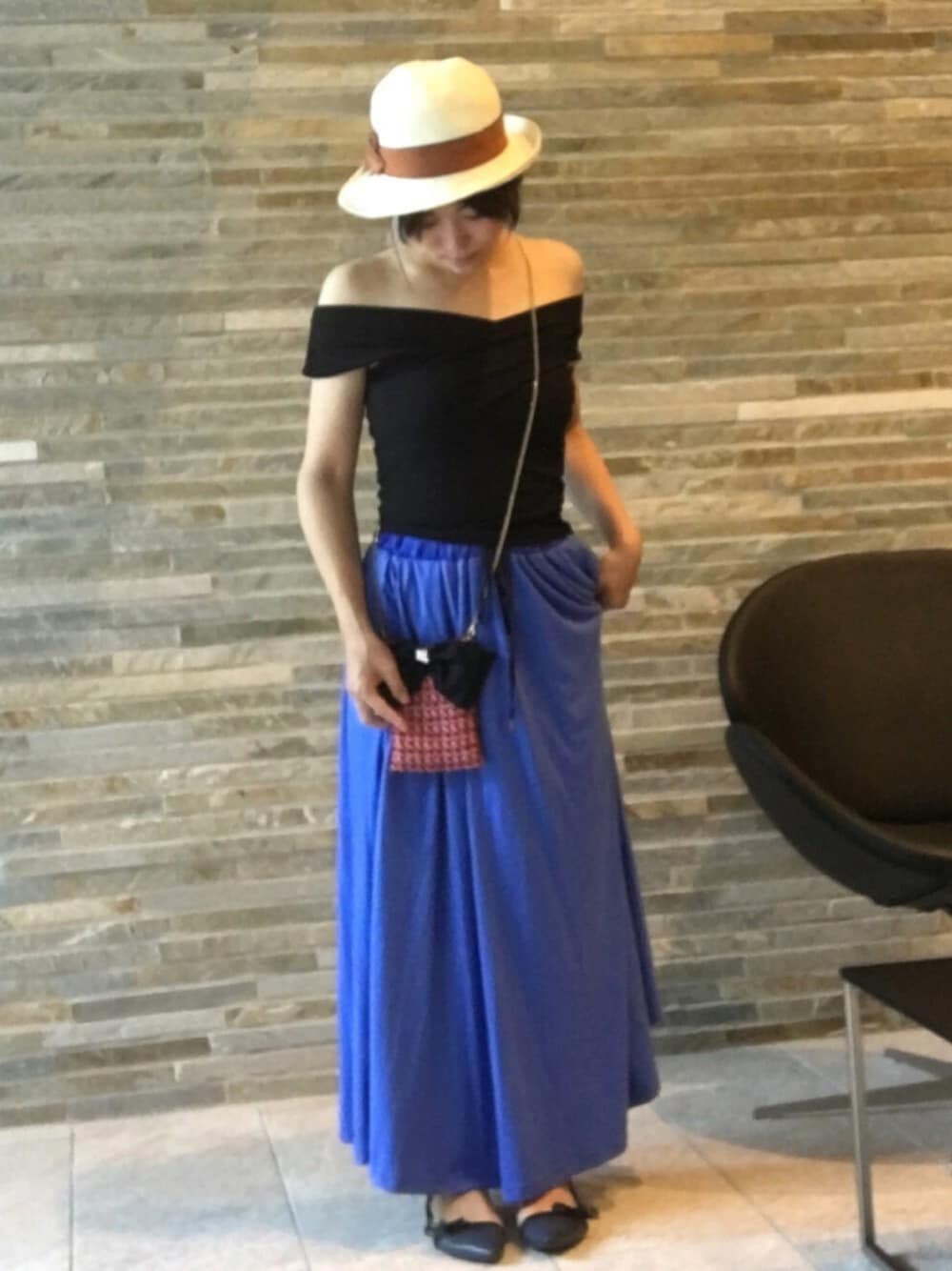 友人とランチへテンシバへ。 猛暑なので、肩出しの解放的なザラのチューブトップに、夏らしいブルーのロンスカを合わせました。白のHime.片耳クルミイヤリングでキラキラ 感をプラスしました