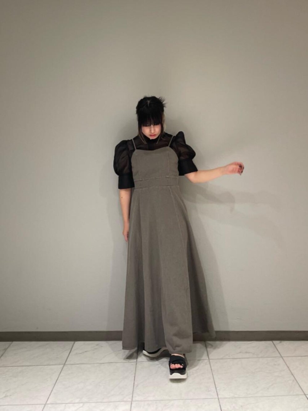 流行りのシアー感あるブラウス!1番上のボタンに大きなパールがついていてかわいい🤍袖はボリュームもありながら程よく透けてくれるので、とても着心地がよく可愛いシルエットになります✨️ キャミワンピは148cm/Mサイズ着用で、厚底サンダルを合わせてぴったりです!肩紐は調節できます🙆♀️ スポサンは21.5cm/Mサイズ着用です!足首のバンドがあるので足が小さめの方でも安心✨️