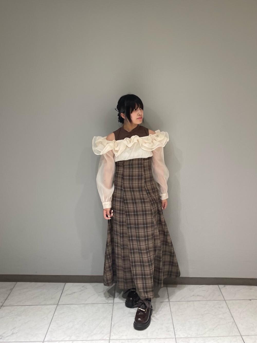 360°のフリルが顔周りを華やかにしてくれます!オフショルにしてもしっかり二の腕カバーできます✨️後ろのリボンでウエストを絞れるので、シルエットがとても綺麗に見えます😊チェックも甘すぎず大人っぽい印象のコーデに!