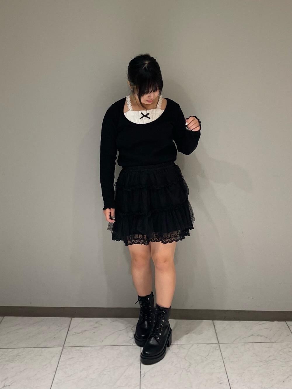 甘めモノトーンコーデ🖤首周りは開きすぎることなくすっきりした印象に!スカートはボリュームがあり足を綺麗に見せてくれます✨秋服には定番の編み上げブーツがおすすめ😊