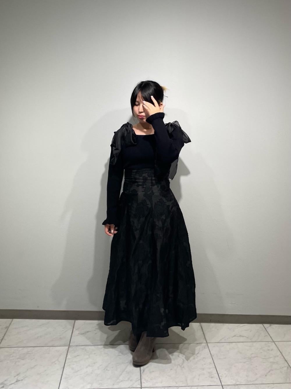 148cm/Sサイズ着用で足首丈です!ウエストはニットなので着やすく、後ろのリボンを結ぶとスタイルアップできます✨️シンプルなデザインで肩リボンでも甘くなりすぎず、これ一枚で大人コーデの完成です☺️