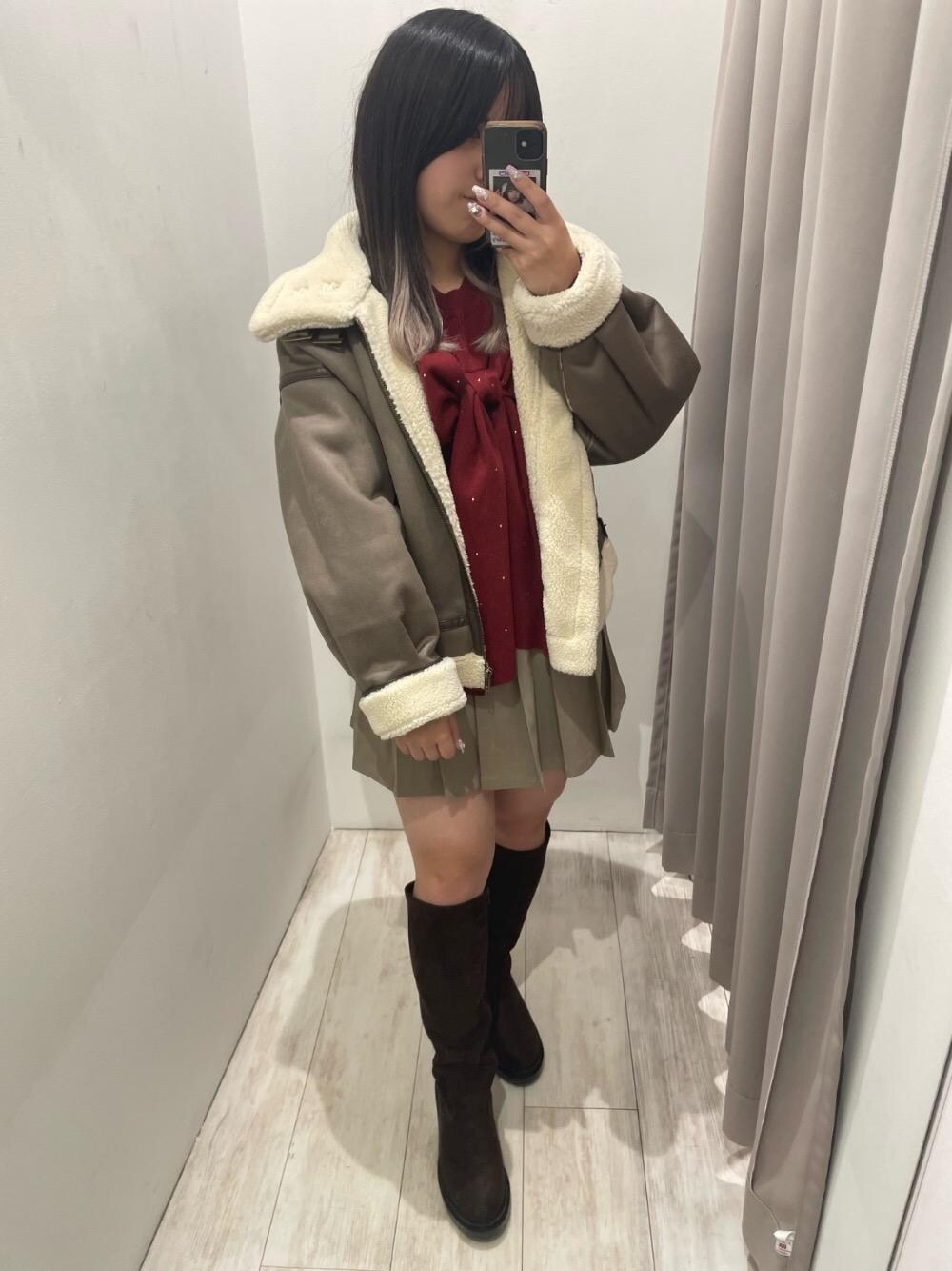 大きめのサイズ感がかわいいアウター🤍丈感が長すぎず短すぎずなので、低身長でもバランス良く着こなせます! リボンが印象的なニットはミニスカと合わせてガーリーコーデにするのがおすすめ✨️