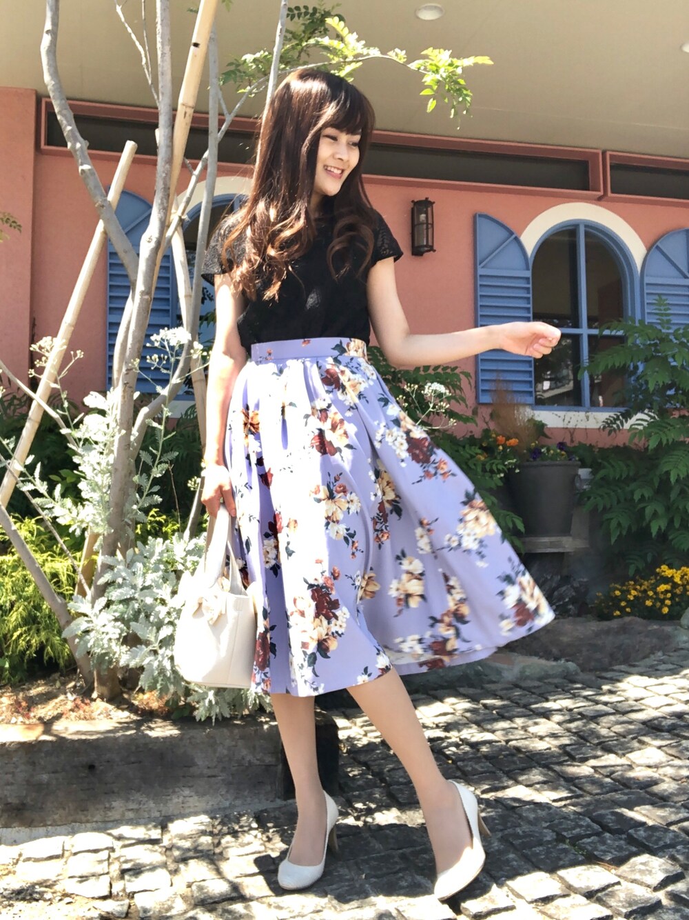 黒トップスで二の腕引き締め、 美肌効果💕 花柄パープルスカートで大人可愛く❤️