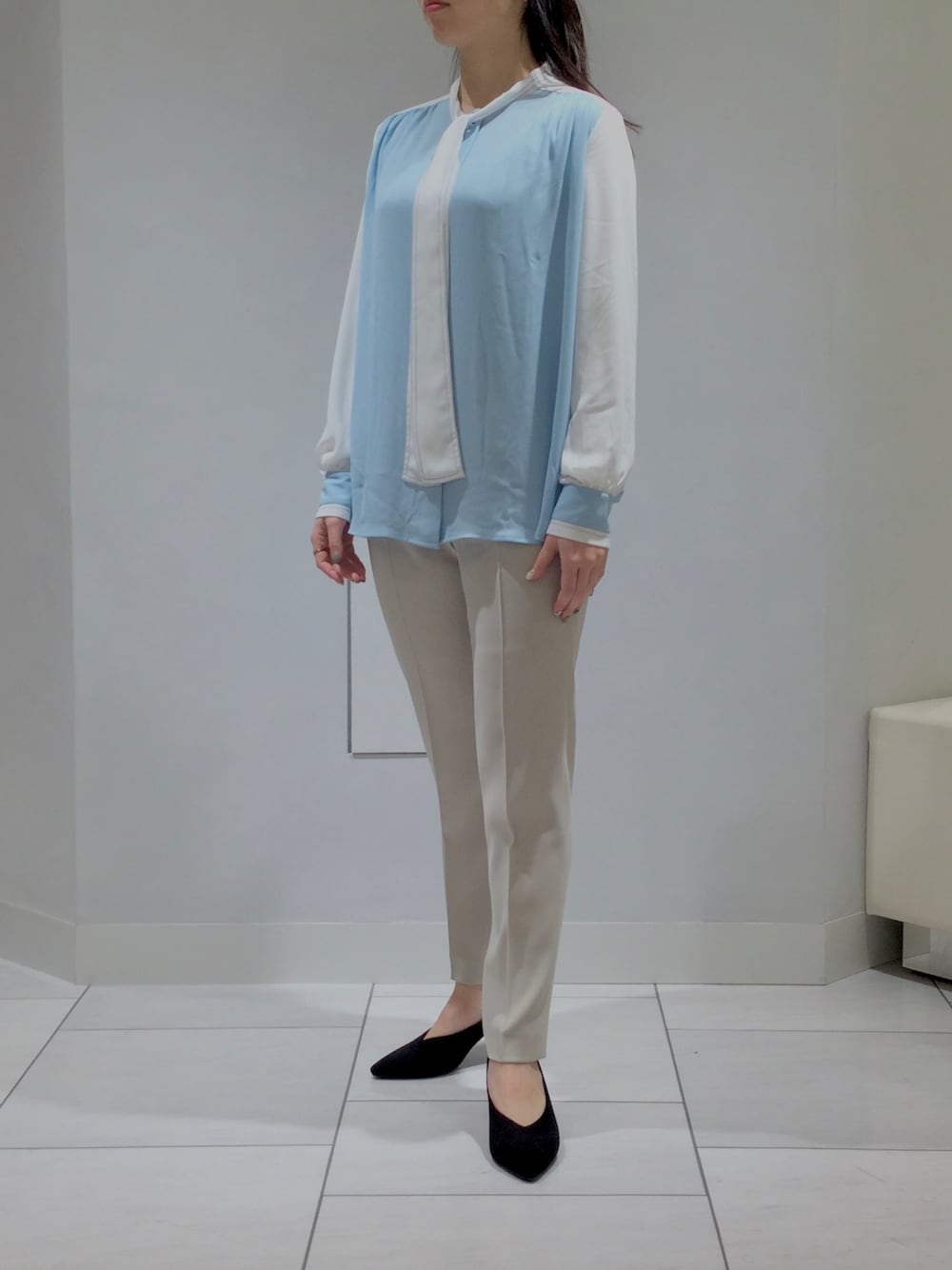 ブラウス 10-11-01-011 0サイズ パンツ 30-11-09-704 0サイズ 爽やかなブルーのボータイブラウス。 オーバーにサラッと来てもオシャレ見え。