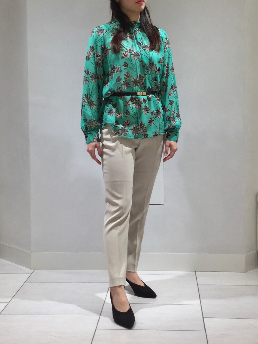 ブラウス 10-11-01-025 1サイズ パンツ 30-11-09-704 0サイズ ベルト 37-02-61-004 1サイズ 鮮やかなグリーンブラウスでお顔写りはっきりと気分もアップ。 ゆったりとしたブラウスはベルトで引き締めてもっとオシャレに。