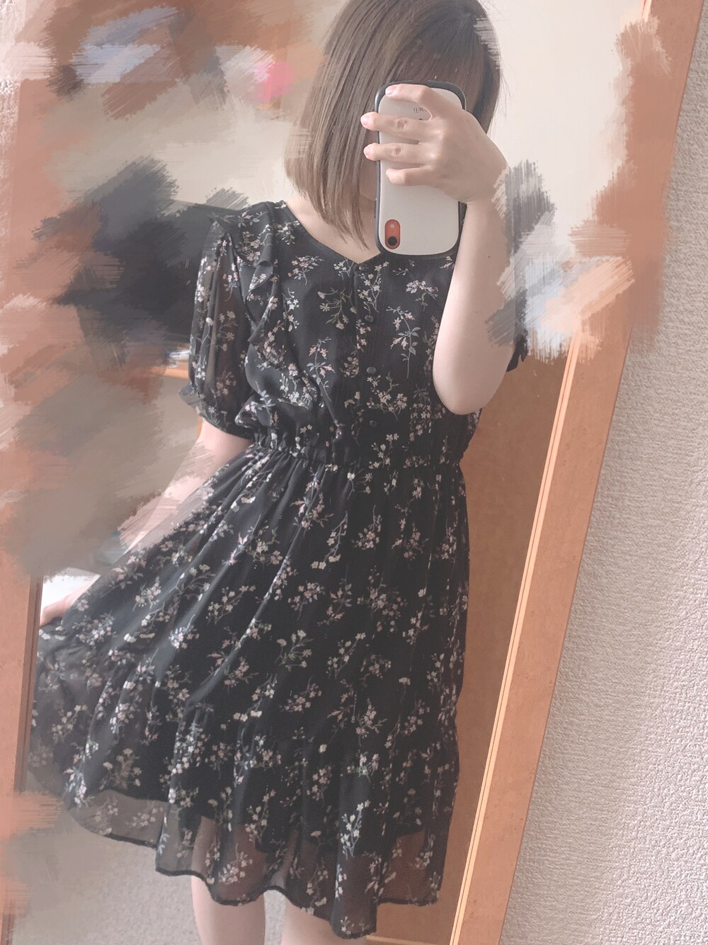 himenaのワンピース「Vフリル花柄シフォン/ミニワンピース」を使ったコーディネート