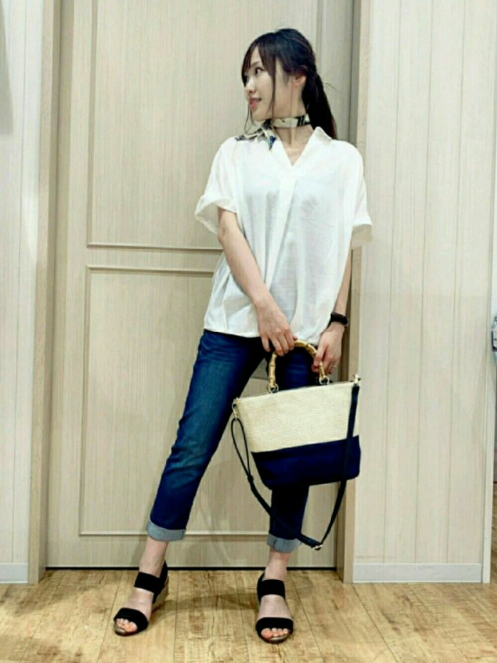 いつもご覧頂きありがとうございます😌 シャツ×デニム 定番ですね☺ ドルマンシャツは抜け感のあるスキッパー。 首元にお気に入りのスカーフを。 夏デニムはストレッチがきいてGood👖 足元はシューダル👡 シンプルだけどカジュアルにもキレイめにも💓