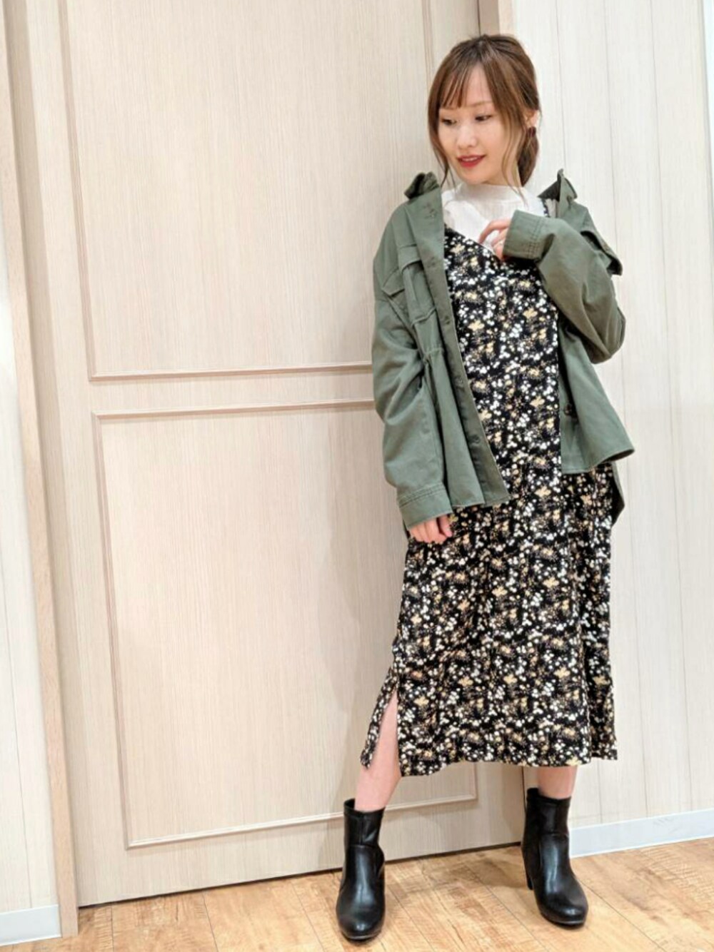 いつもご覧頂きありがとうございます🙇❤️ 存在感のある花柄キャミワンピは ミモレ丈でスリット入りなので 女性らしく華奢な印象に🥰❣️ ミニタリージャケットは 羽織るだけでこなれ感も増しますよね💞