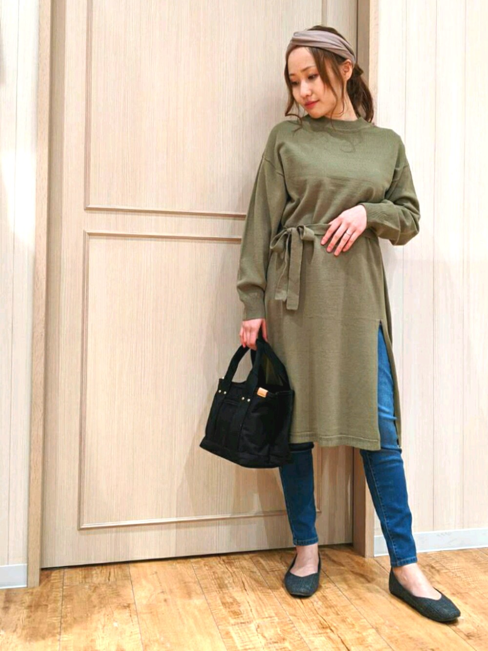 こんにちは🥰 スリット深めのベルト付きニットワンピースは デニムが見えて細身え効果も❣️ 一気に春っぽい色合いが着たくなるこの頃🌸 ウエストリボンでウエストマークしても はずしてゆるーくきこなしてもgood🧚 まだまだ寒いのでアウター必須な毎日🥺💦 皆さまもあったかくして お過ごしくださいね😌❤️