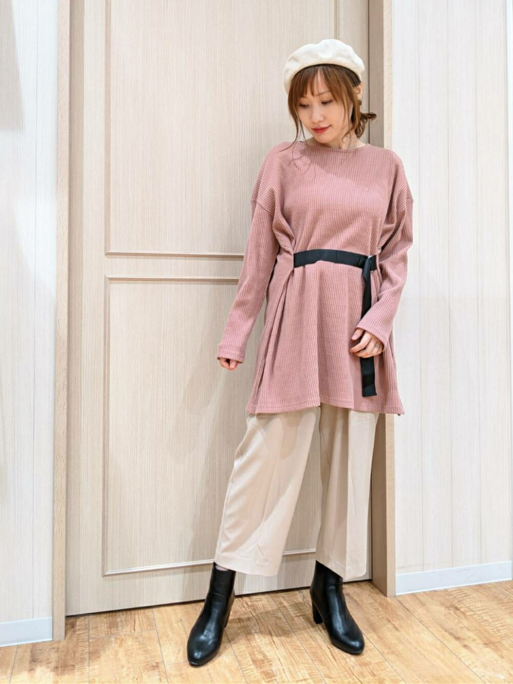 こんにちは🥰 ニュアンスカラーが新鮮🌸 気持ちも明るくなりますね🌟 長めのベルト付きプルオーバーは リブ素材でトレンド感もあり レイヤードスタイルにも合わせやすい😌 ウエストマークしてくれて脚長効果も❣️ ショートブーツ👢は合皮素材で 柔らかい印象をしめてくれますね💓