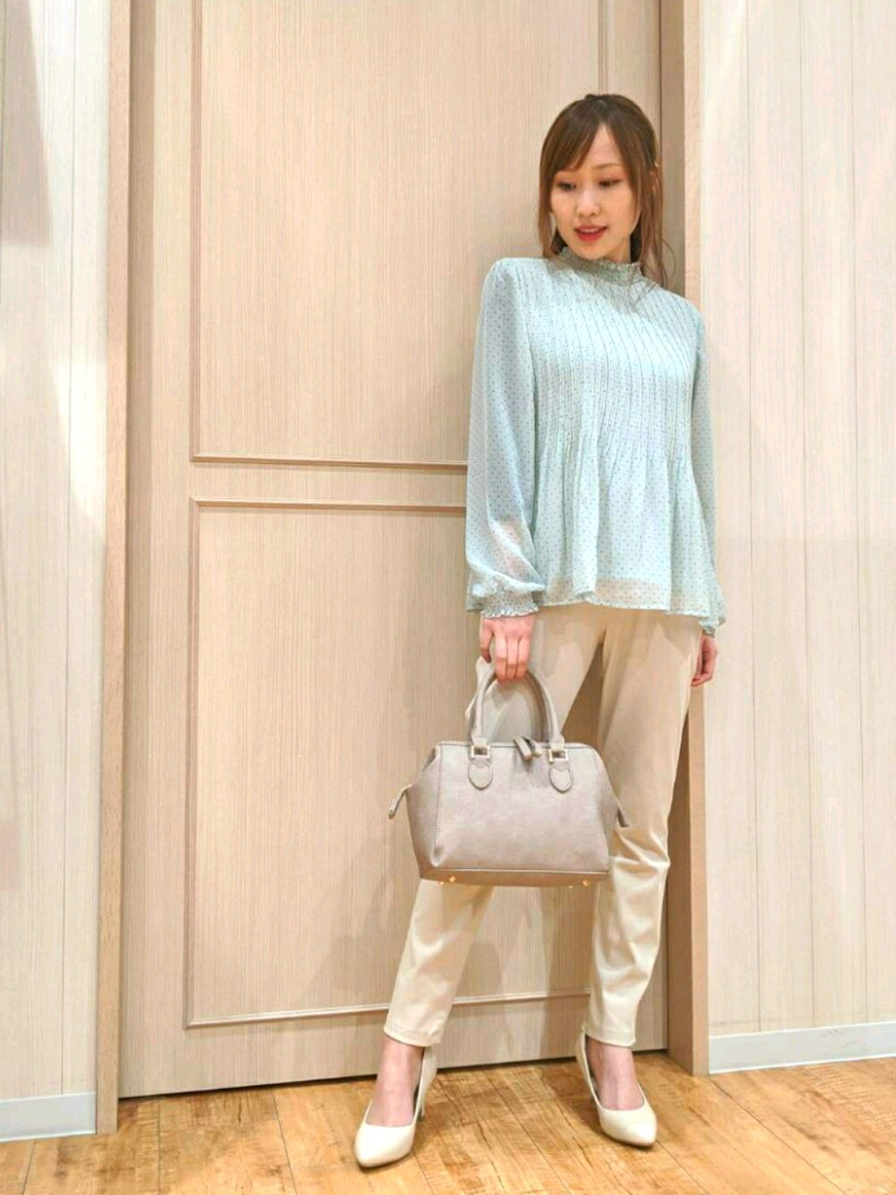 おはようございます☺️ セレモニーコーデにもコーデ組したブラウス❣️ ドット柄でパステルなミントグリーンが 爽やかさと上品さをプラス🌸 フェミニンは雰囲気ですが 他のパンツや小物はベージュでまとめると よりブラウスを引き立てますよね🥺💓 袖口とネックにギャザーを寄せて リラクシーな長めな丈感 プリーツも入っているので動きのあるシルエットです🧚 こちらのコーデにジャケットを着ても セレモニーぽく着こなせそうですね🌈