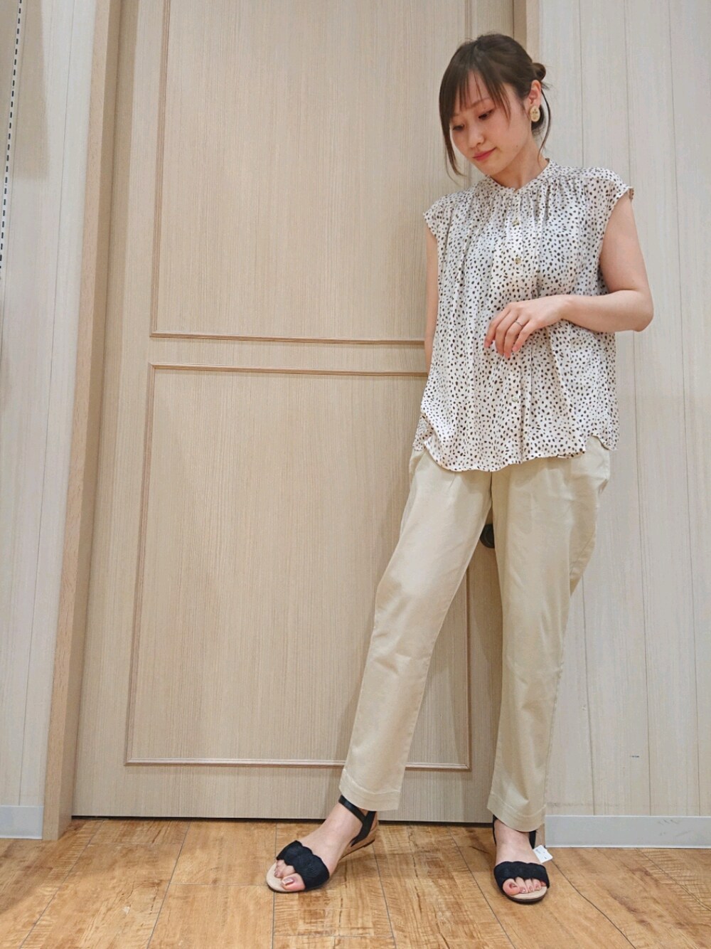 いつもご覧頂きありがとうございます❤️ サテンノースリーブブラウスは トレンドのバンドカラーに 金のボタンが並び上品に🥰 さらっとしていて丈感も短すぎず長すぎず 調度いいですよね🌟 パンチはイージーテーパードパンツ ウエストがドロスト紐になっていて ボトムインしてもカジュアルに アウトでもきれいなラインなので 着回し抜群です🥺✨