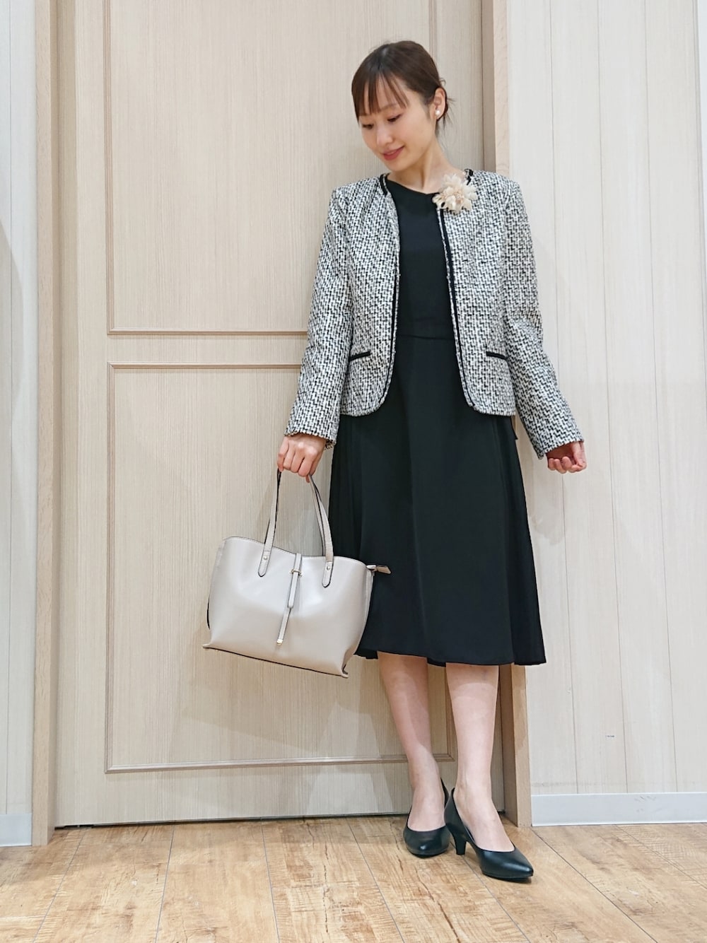 himi(SHOO・LA・RUE)のノーカラージャケット「【S-5L】ネオリッチツイードジャケット」を使ったコーディネート