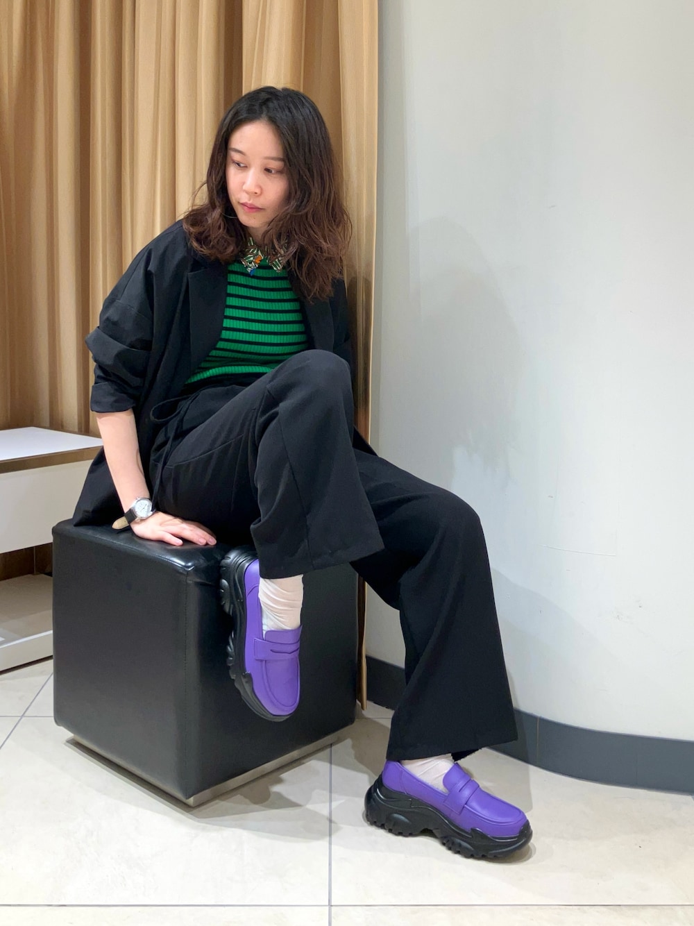【キャラの濃いアイテム同士は意外と合わせやすい💡】 いつもご閲覧ありがとうございます☺️ 今回はトップスの個性に負けない位の存在感を放つ、 紫の変形ソールローファーのご紹介です💜 一枚だけでコーデの方向性か決まるアイテムって意外と多いですよね❗️ 存在感がある色や柄が喧嘩しないように他をベーシックに揃えると、 なぜか主役だけ浮いてしまうことも。👀 派手なアイテムにはあえて派手なアイテムを合わせると、 意外な効果アリです👌 店舗スタッフ:AM