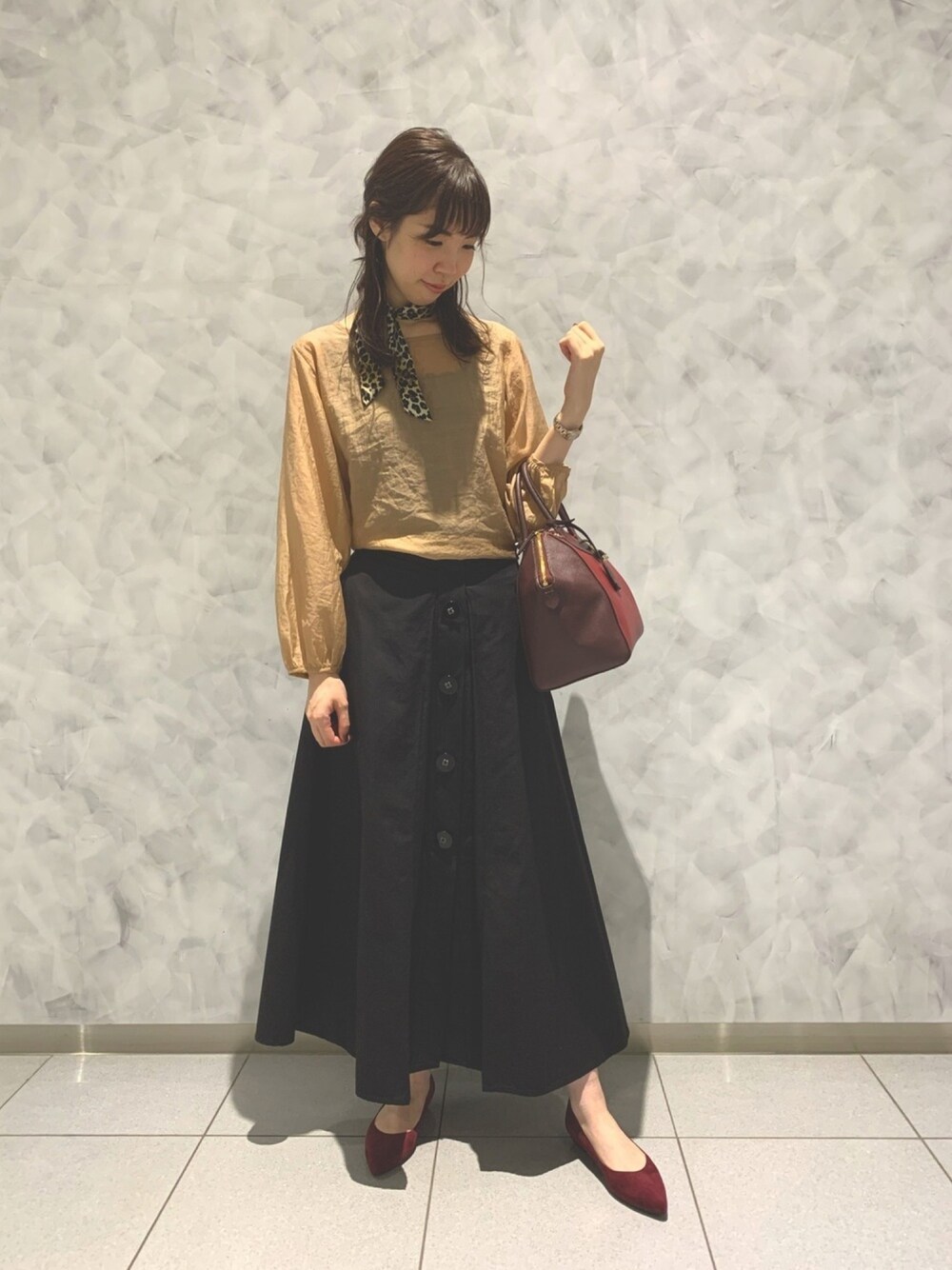 上品な秋カラーのフラットパンプスは、柔らかい足あたりで脱げにくく秋のデートスタイルにもオススメです! 黒タイツに合わせても相性バッチリ!