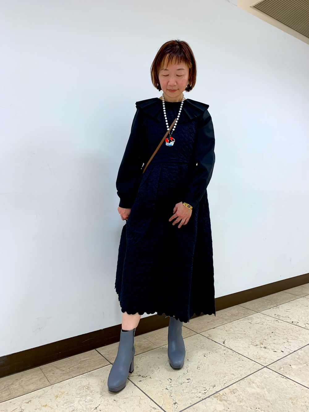 ご覧いただきありがとうございます! ペイズリー柄のプラットフォームが洗練されたブーツをモノトーンのワンピースに合わせました。 上品なブルーグレーは春先までお履き頂けます。