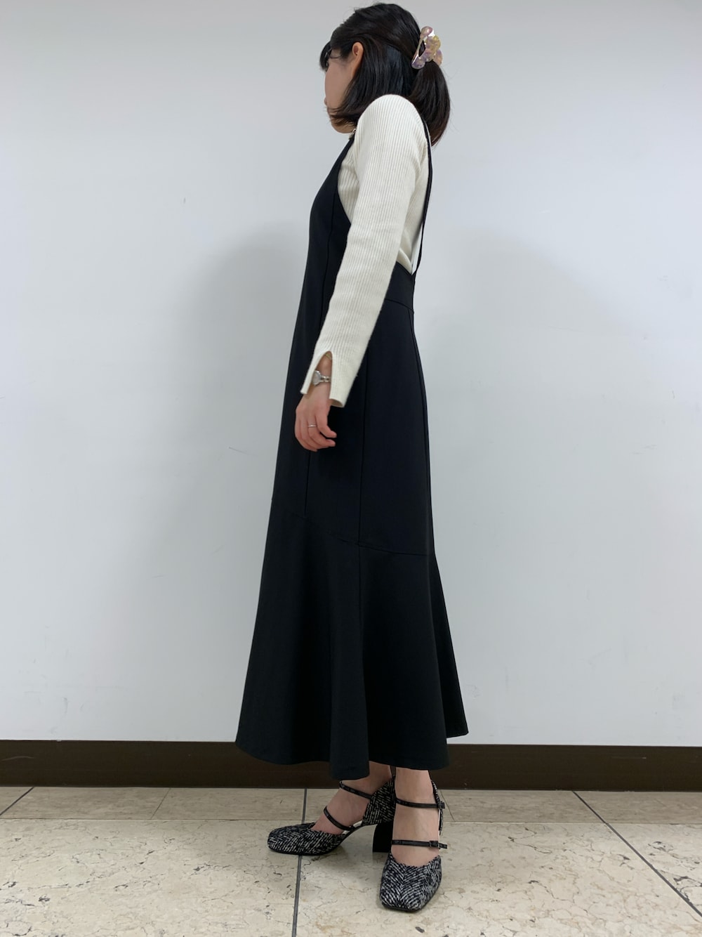 ブラック系のパンプスを着用したレディースの秋コーディネートの2枚目の写真