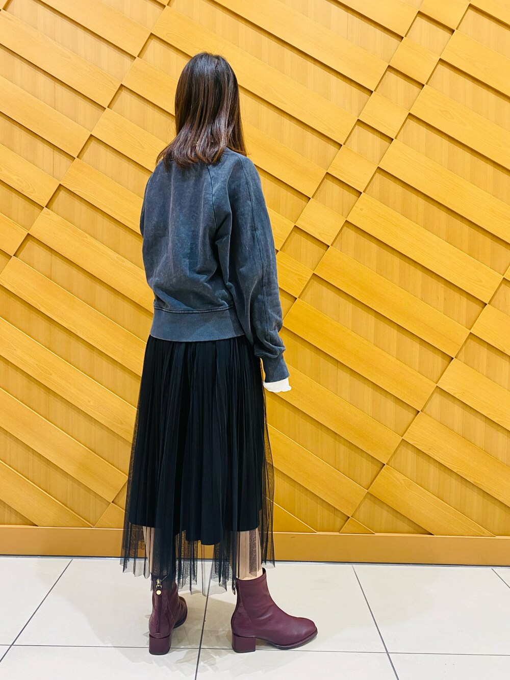 昨年大ヒットしたブーツで新色のボルドーに チュールスカートでコーデを組んでみました! なんといっても後ろの型押し後ろファスナーが お洒落ですよね♡ 北海道でも安心の冬底仕様もご用意しておりますのでぜひ店頭でご覧下さいませ♡