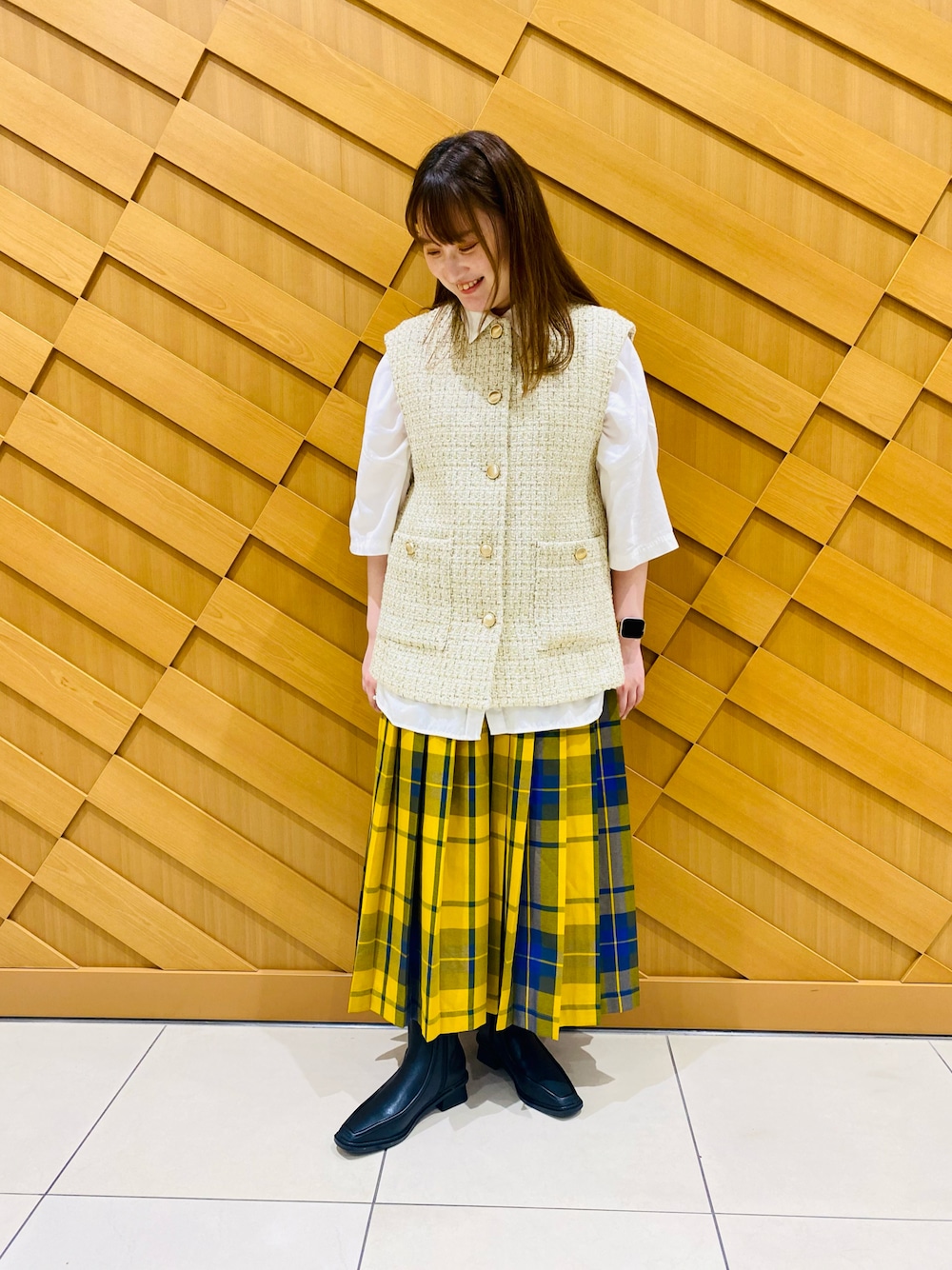 本日は足元スッキリと見せてくれて 内側ファスナー仕様で脱ぎ履きが楽なブーツを合わせてみました⭐︎ ツイード柄ベスト×チェックプリーツスカートで 合わせても足元を引き締まる色とスタイリッシュなブーツ合わせれば抜群に合います💛 いいね👍 お気に入り登録ありがとうございます😊
