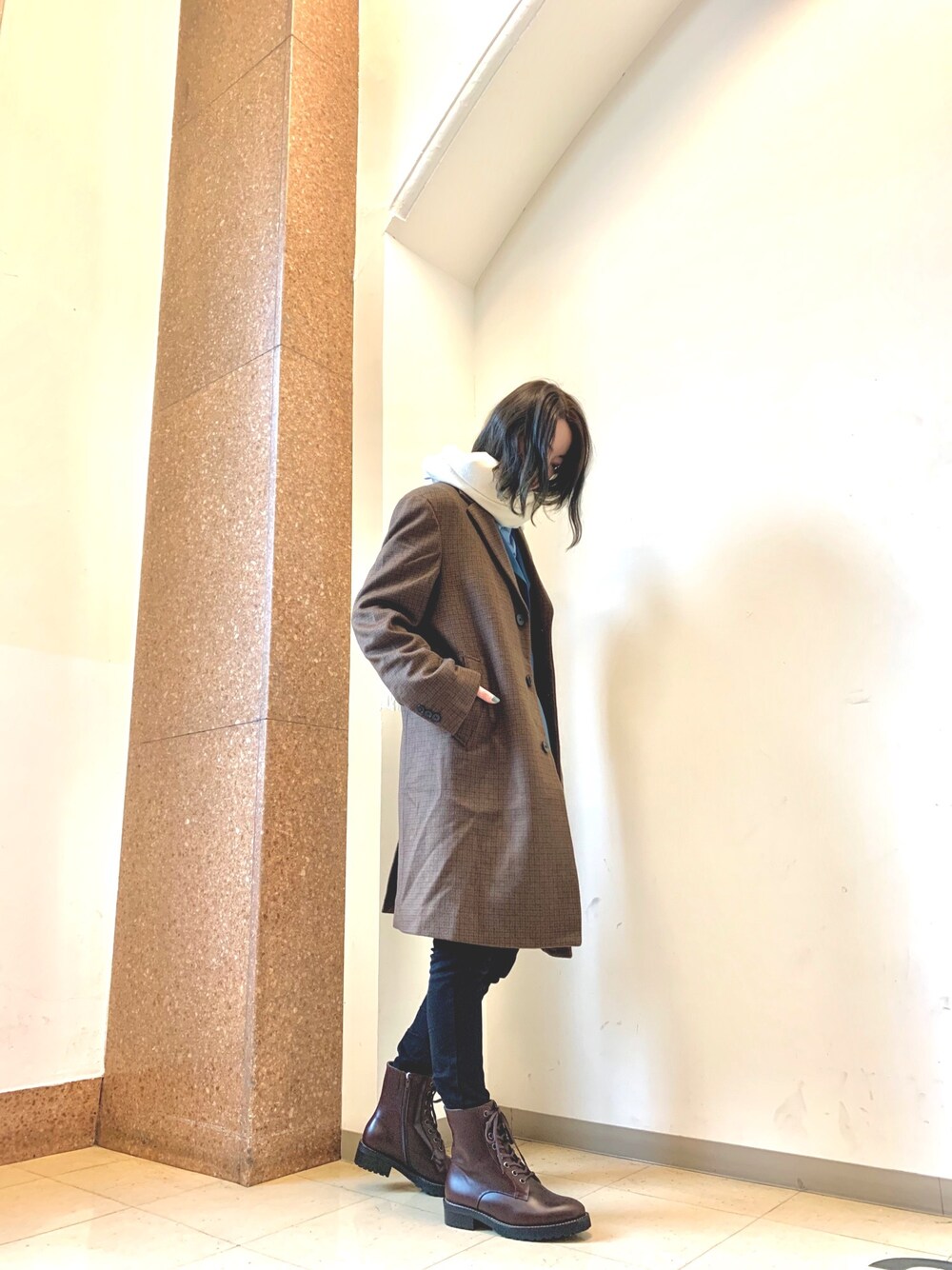 HIMIKO/レースアップブーツ/601415/ノウチャ コーデに重圧感の増す秋冬にピッタリの編み上げブーツ🥾 牛革ならではの風合いがあり、履き込むほどに味が出る一足です👌 光沢感があり、光の加減で表情が変わります✨ 今回は、コートと色味を合わせてカッコ良くまとめてみました❣️ いつもいいね👍フォルダ登録ありがとうございます😊